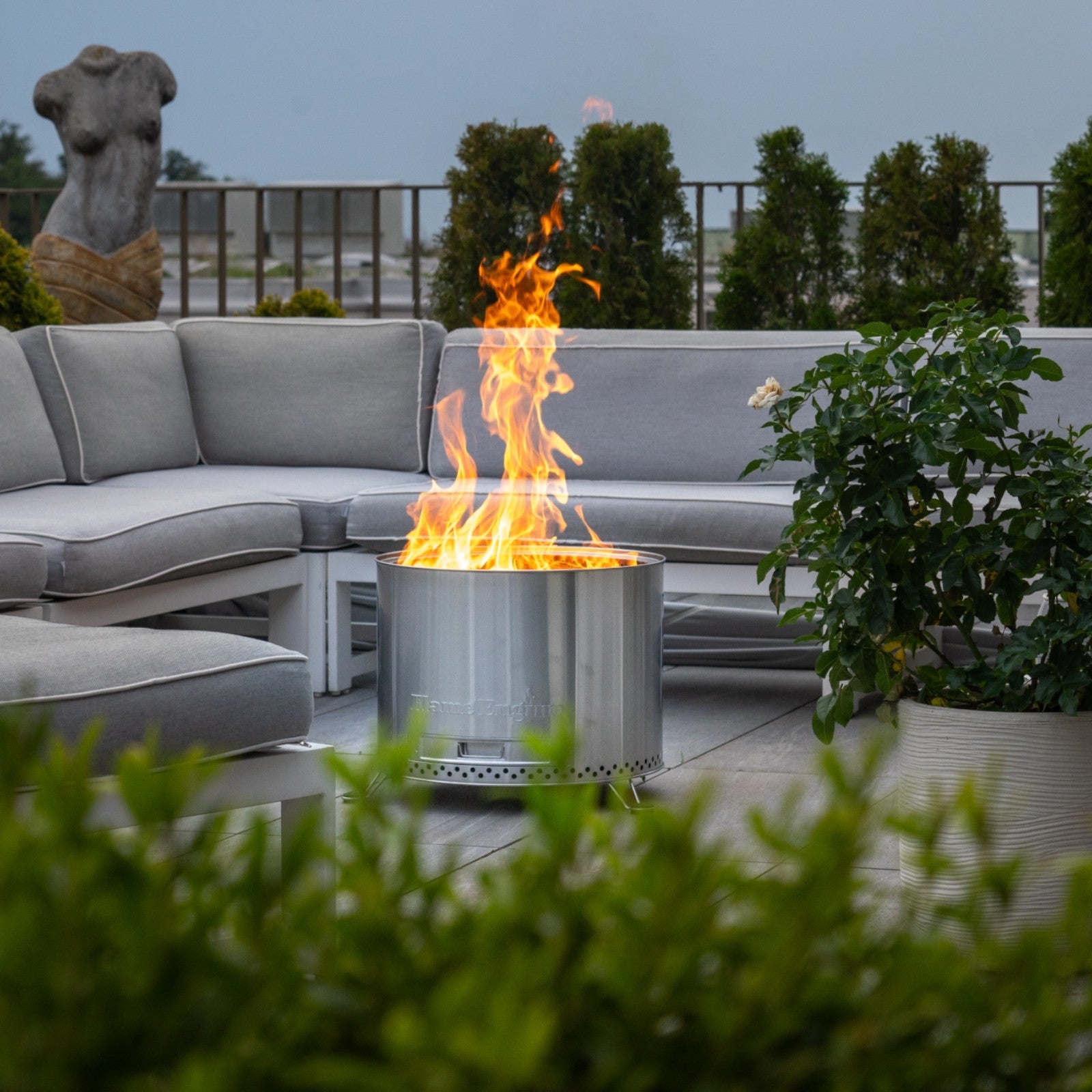 Lock för Flame Engine Buddy: Genom att lägga på locket kvävs elden omedelbart. För att säkerställa att elden slocknar helt och de glödande ask- och kolpartiklarna brinner ut bör locket vara stängt ett tag. Locket fungerar också som skydd mot väder och vind. Dessutom förvandlar det eldstaden till ett stiligt sidobord eller praktisk pall när den har svalnat.