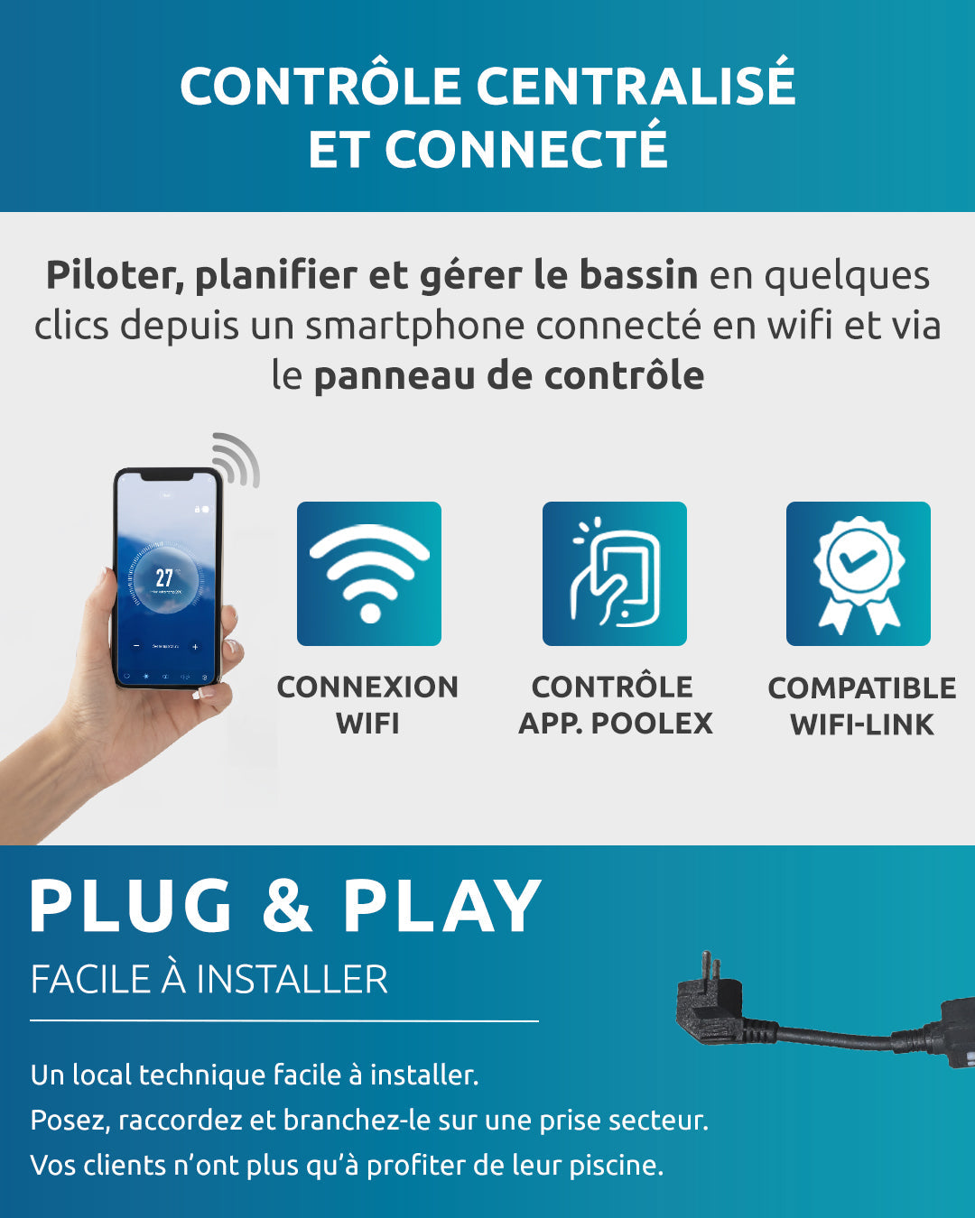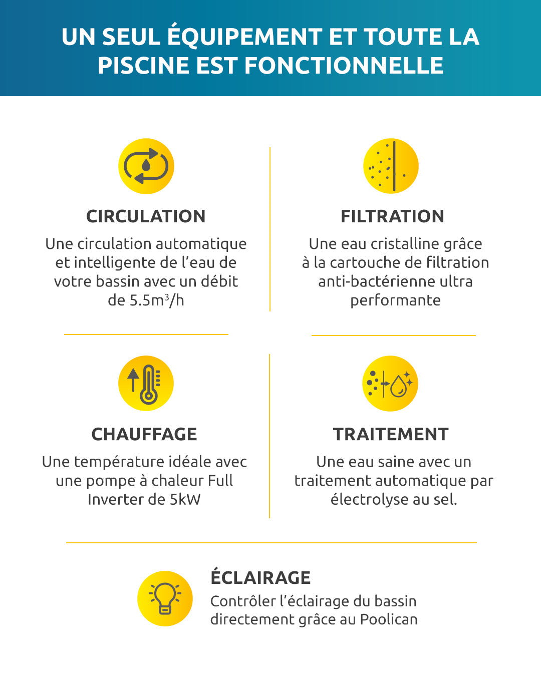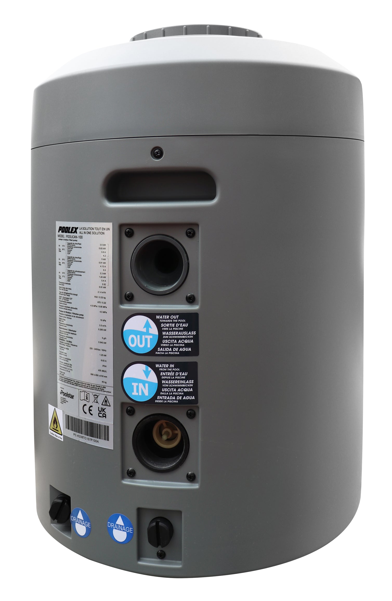 Poolican är ett ultra-kompakt och komplett “teknikrum” i ett enda skåp för pooler upp till 25 m³. Den samlar cirkulation, filtrering, saltklorinator och värmepump i en och samma enhet – med WiFi-styrning via Poolex-appen och enkel Plug & Play-installation.