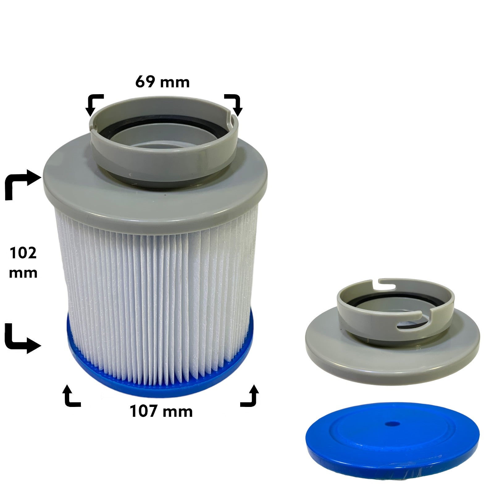 Var noggrann när ni mäter era filter så att ni får rätt modell, generellt så gör det inget att filtrets kropp är lite mindre eller lite större då flera filter kan passa fler modeller, rådfråga oss om du har funderingar om detta filter passar just ert spabad. Det viktigaste är att ni hittar samma mått på anslutningen samt att det är samma typ av topp som ert befintliga filter.
